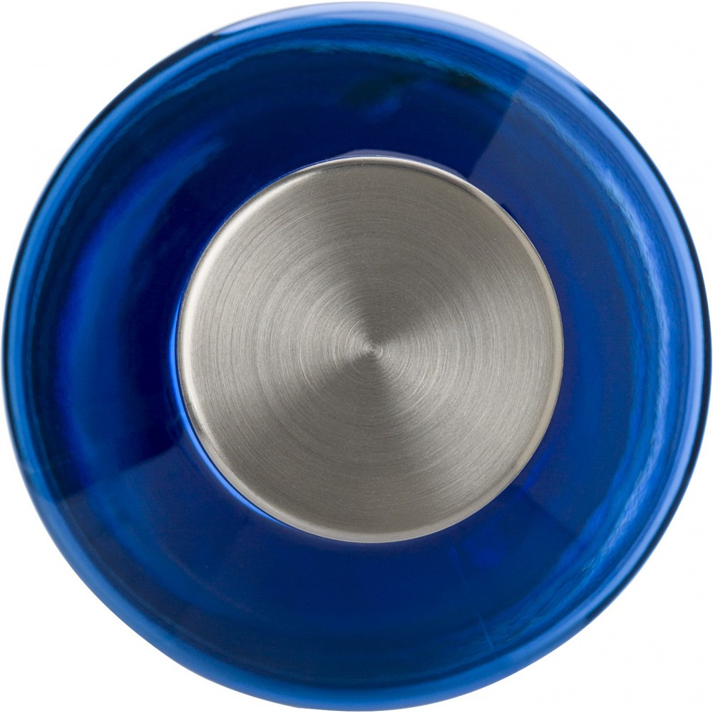 Átlátszó vizespalack fém alsó résszel és fém csavaros kupakkal. A kupak gumigyűrűje színben illeszkedik a palack színével. 850 ml. Nem szivárgásmentes. Mosogatógépben nem tisztítható. BPA-mentes műanyag.