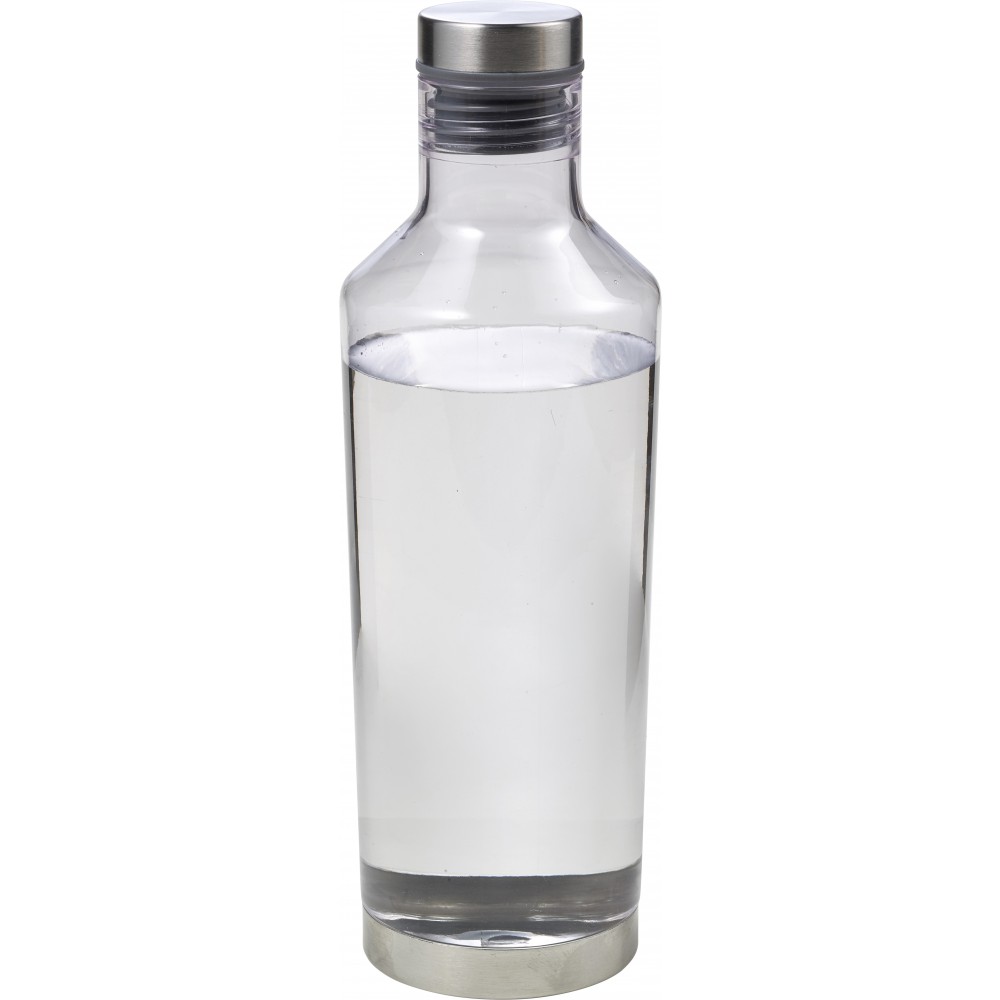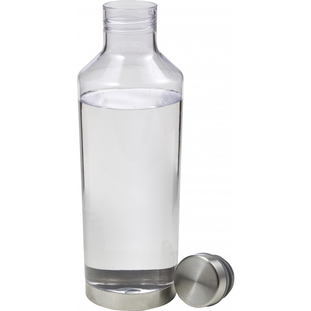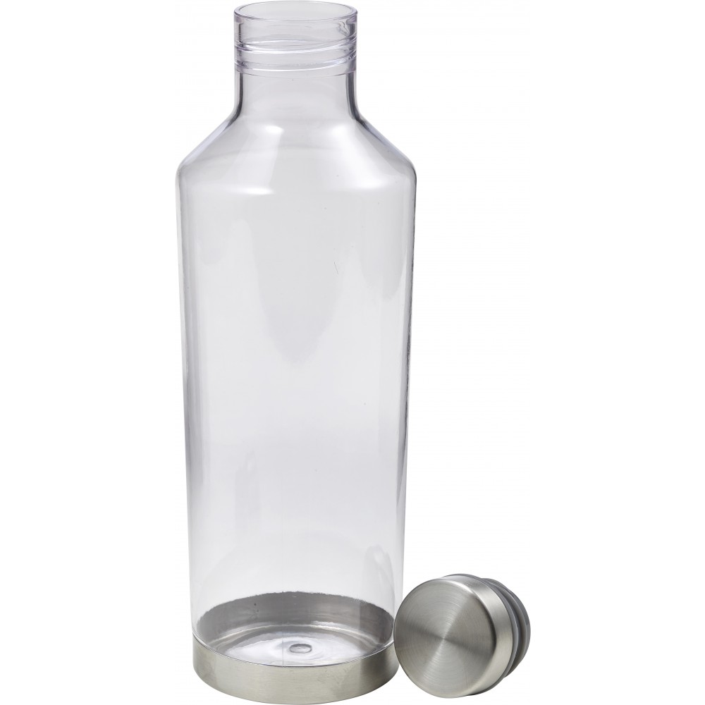Átlátszó vizespalack fém alsó résszel és fém csavaros kupakkal. A kupak gumigyűrűje színben illeszkedik a palack színével. 850 ml. Nem szivárgásmentes. Mosogatógépben nem tisztítható. BPA-mentes műanyag.