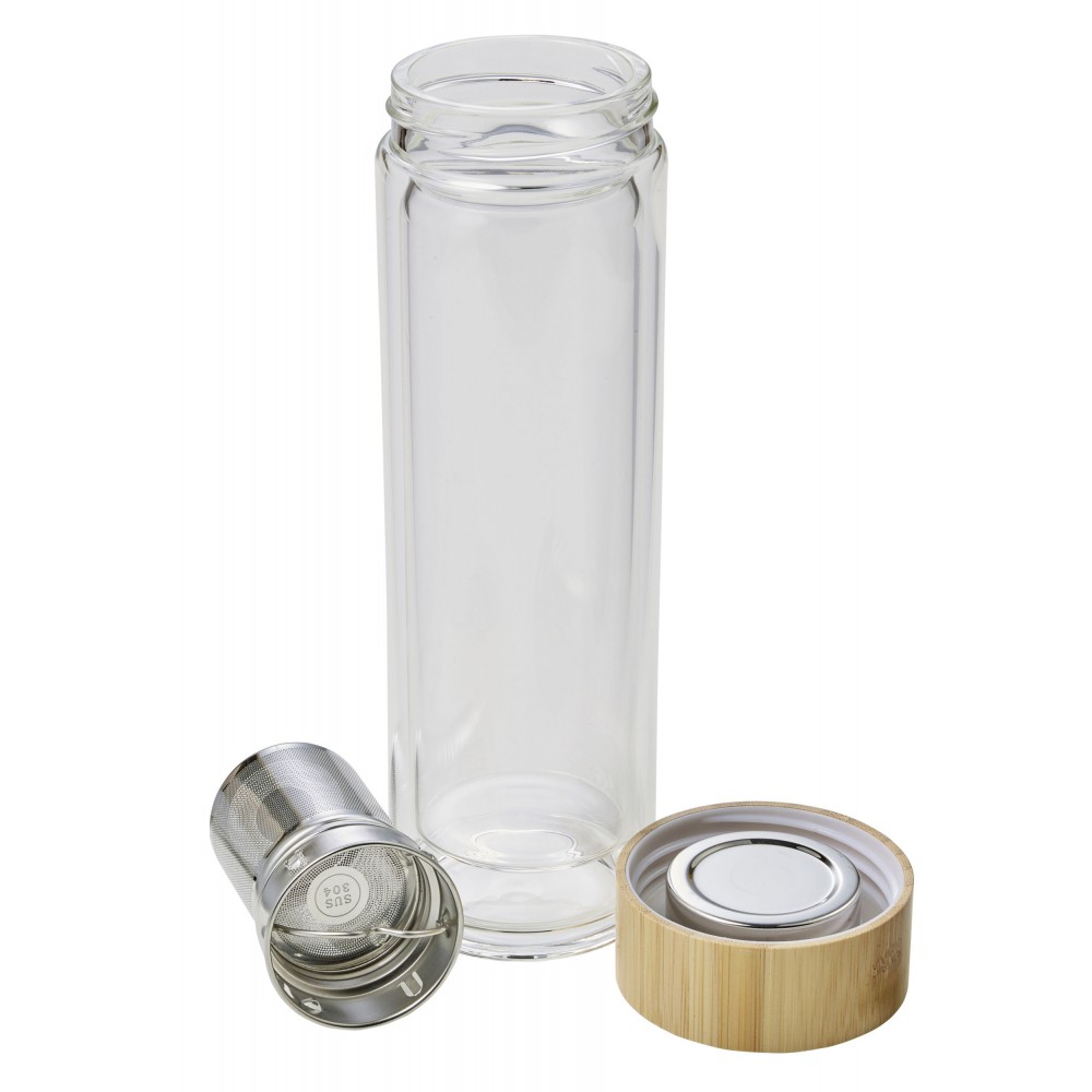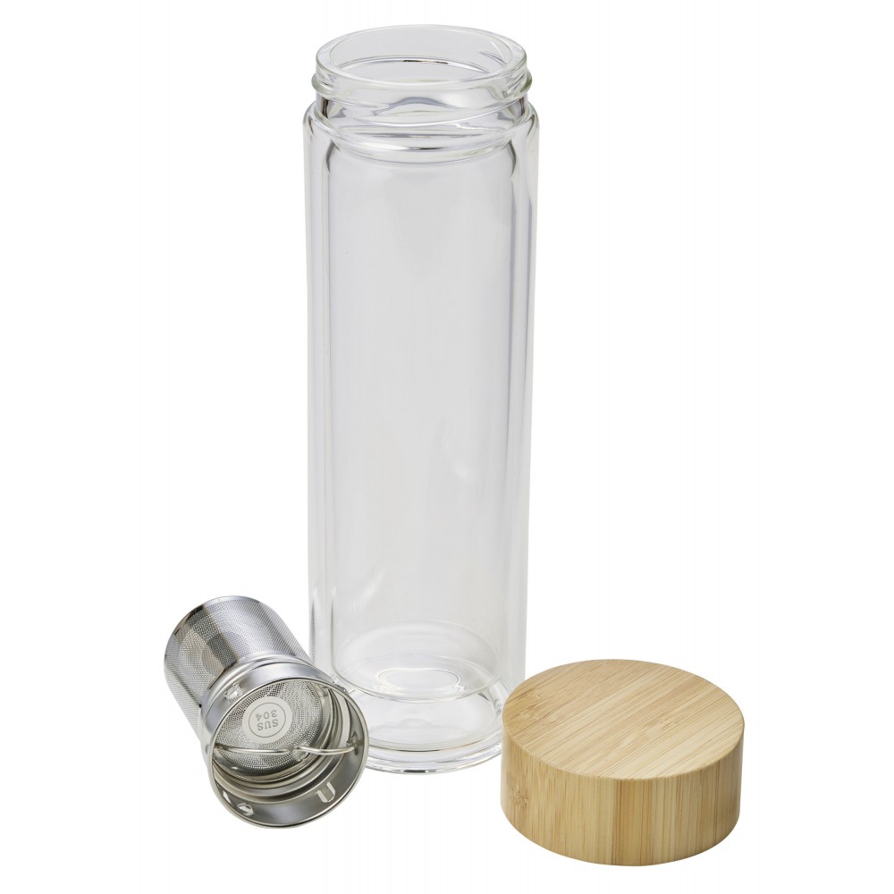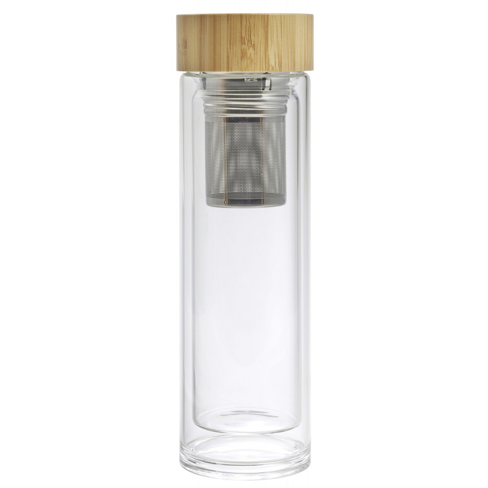 Duplafalú üveg bambusz kupakkal és fém teaszűrővel. Űrtartalom: 420 ml.